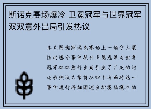 本文围绕斯诺克赛场上一场令人震惊的爆冷事件展开,卫冕冠军与世界冠军双双意外出局,引发了广泛的讨论和热议。文章将从四个方面对这一事件进行详细阐述,分析赛场爆冷的原因、卫冕冠军和世界冠军的失利背后,以及这一事件对斯诺克运动和球迷的影响。首先,文章将探讨为何这样的爆冷结果能够发生;其次,分析卫冕冠军和世界冠军的表现失常,寻找其中的根本原因;接着,讨论赛场爆冷给斯诺克运动带来的冲击,尤其是对赛事品牌和影响力的影响;最后,从球迷的角度来审视这一事件,探讨他们的情感反应以及对未来比赛的期待。整篇文章将通过这些方面的分析,为读者提供一幅完整的事件画像,并引发更多思考。